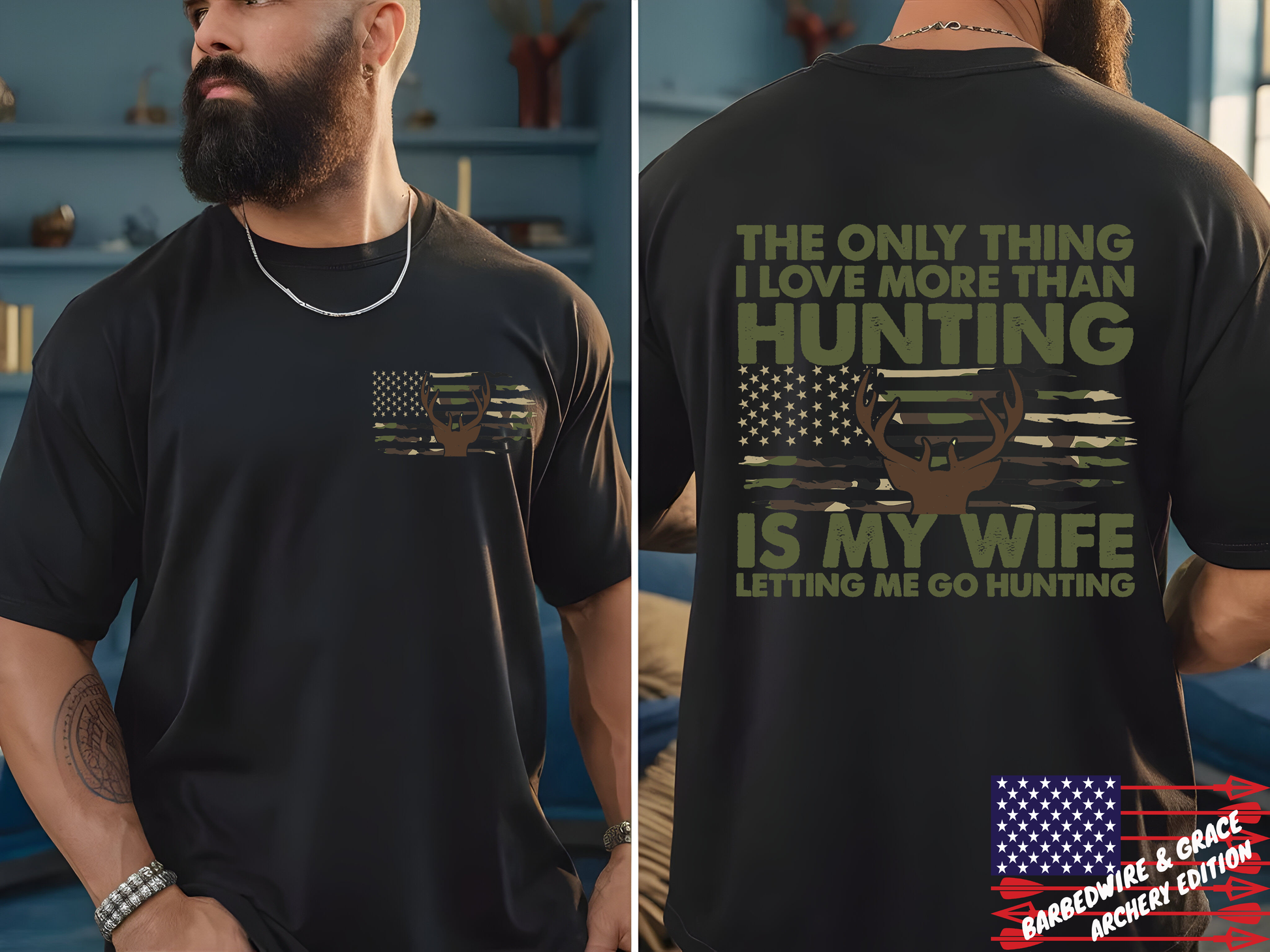 Show off your playful side with the “My Wife” design—because nothing beats hunting, except a wife who happily lets you go! This fun and lighthearted piece celebrates the perfect balance of love and adventure. Wear it proudly and share a smile with every hunt!